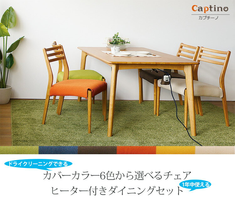 なにとぞご了承くださいませ商品 カプチーノ ダイニング5点セット サイズ テーブル:幅1350×奥行800×高さ700mm チェア:幅500×奥行530×高さ780mm、座面高さ:440mm 素材 主材:ラバーウッド 塗装:ウレタン塗装 座面張材:布張(ポリエステル100%)、ドライクリーニング可 ヒーター メトロ製ヒーター 生産 ベトナム 組立式 - 備考 天然木ラバーウッド材を使ったヒーター付きダイニングシリーズです。